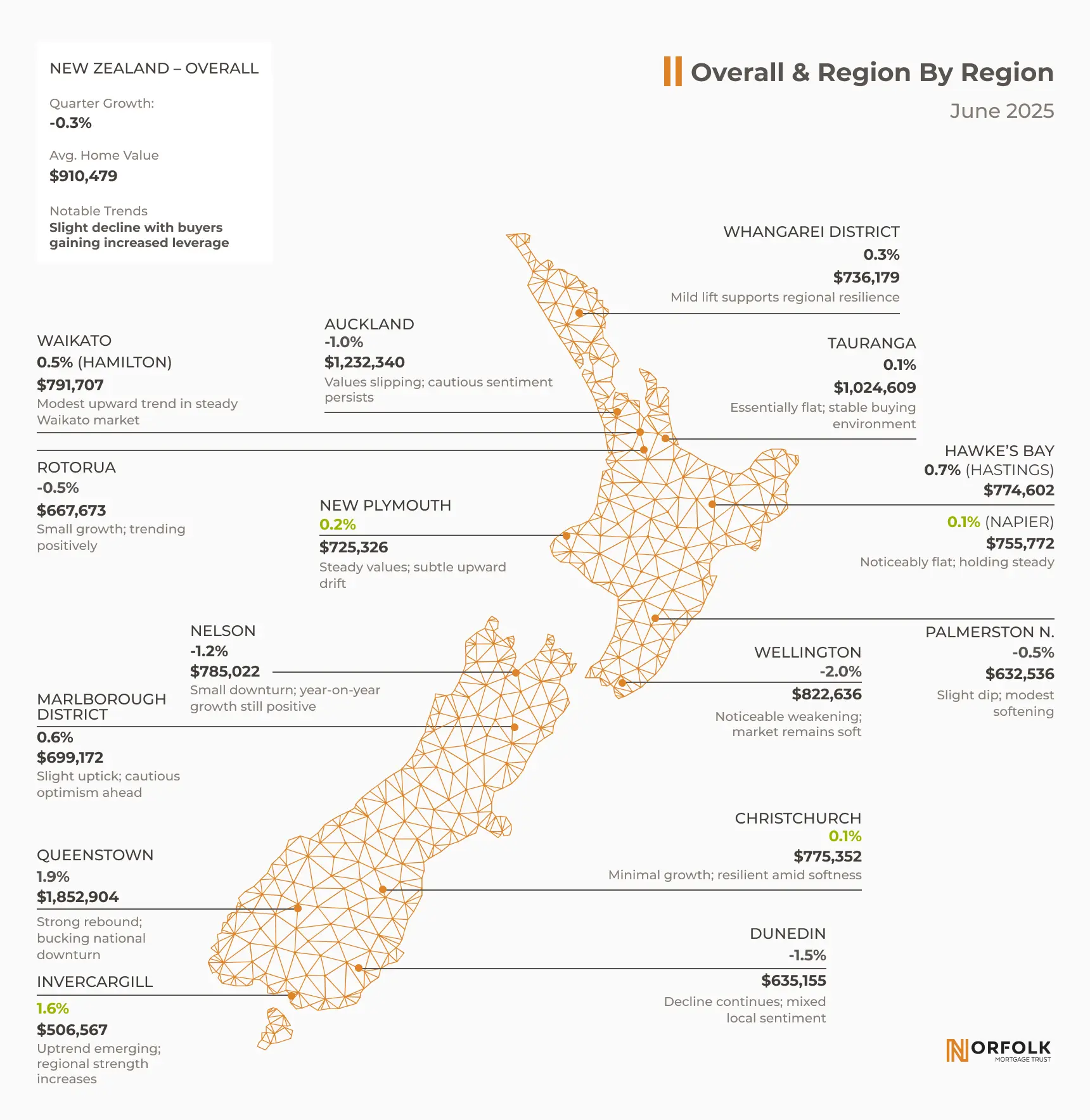 As we move into the second half of 2025, the New Zealand property market continues to recalibrate. The latest QV House Price Index shows average home values edged down 0.3% over the June quarter – a modest decline that reflects ongoing buyer caution, high stock levels and a broader sense of economic uncertainty.