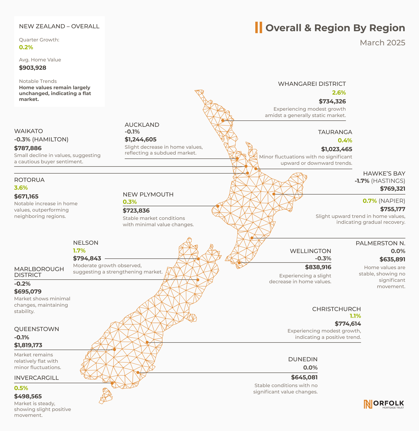 As the warmth of summer fades and cooler days settle in, the latest QV House Price Index paints a picture of a property market that’s steady – almost motionless – across much of New Zealand. But at Norfolk Mortgage Trust, we don’t see flat conditions as a sign to sit back. Instead, we view this as a strategic window – a chance for informed investors to capitalise while others wait on the sidelines.